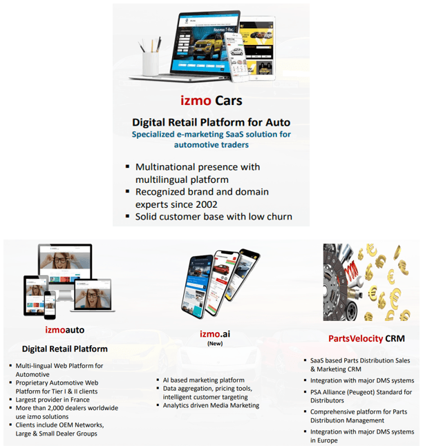 • The company offers a digital retail platform featuring specialized e-marketing SaaS solutions for automotive dealers, including a multilingual web platform, AI-driven marketing tools, pricing solutions, and a SaaS-based CRM for parts distribution. As the leading provider in France, it supports over 2,000 dealers worldwide and powers approximately 80% of all global rental car listings through Izmo Cars.